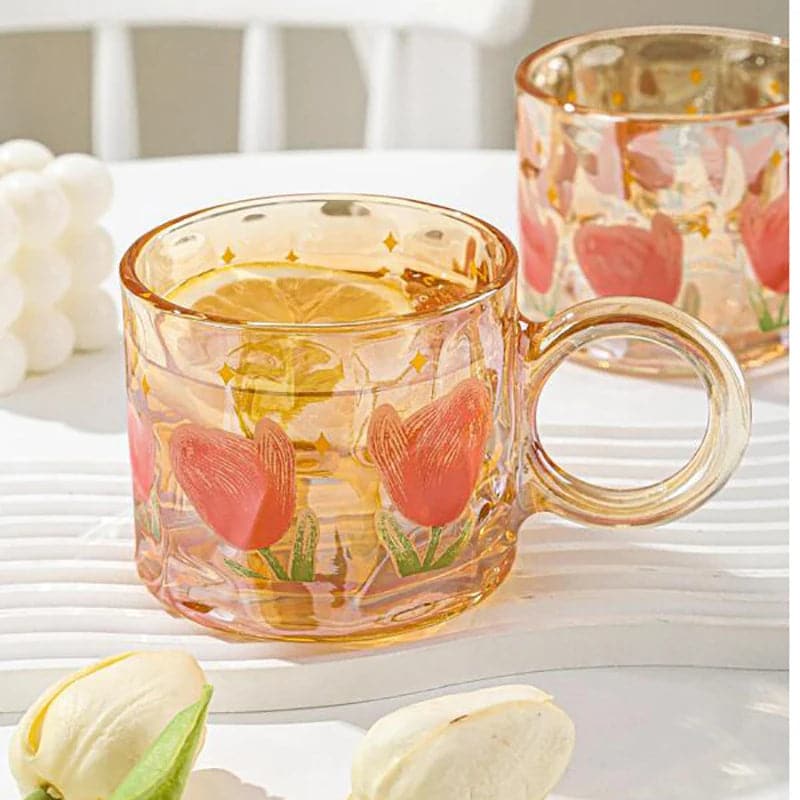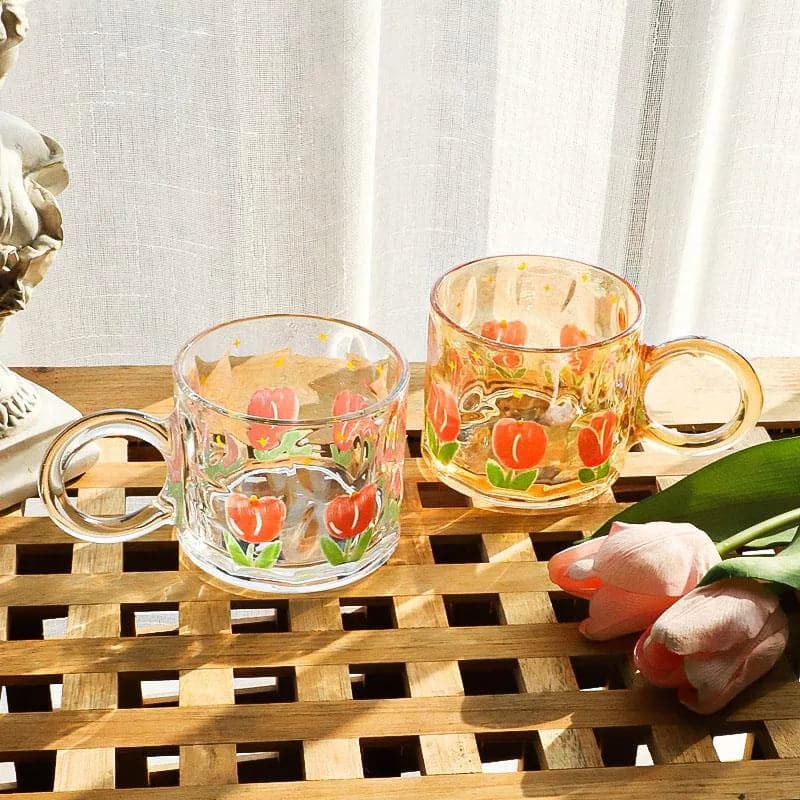 Adorable Tulip Printed Glass Mug - High-Value Ins Style Amber Glass Mug