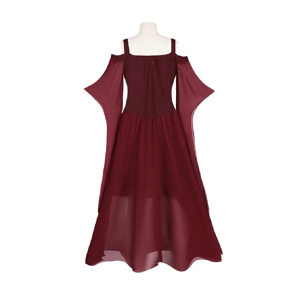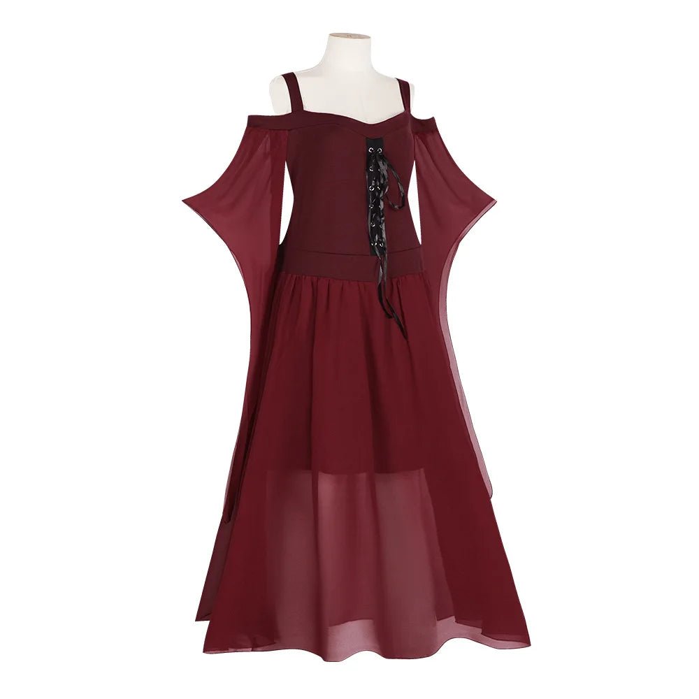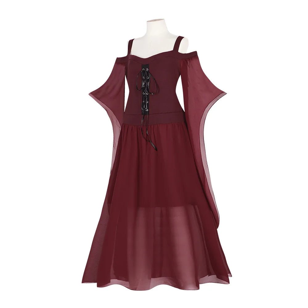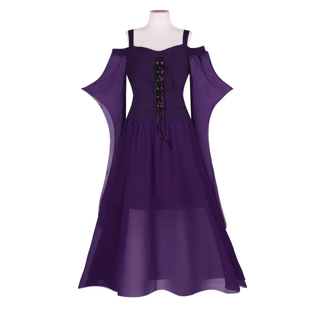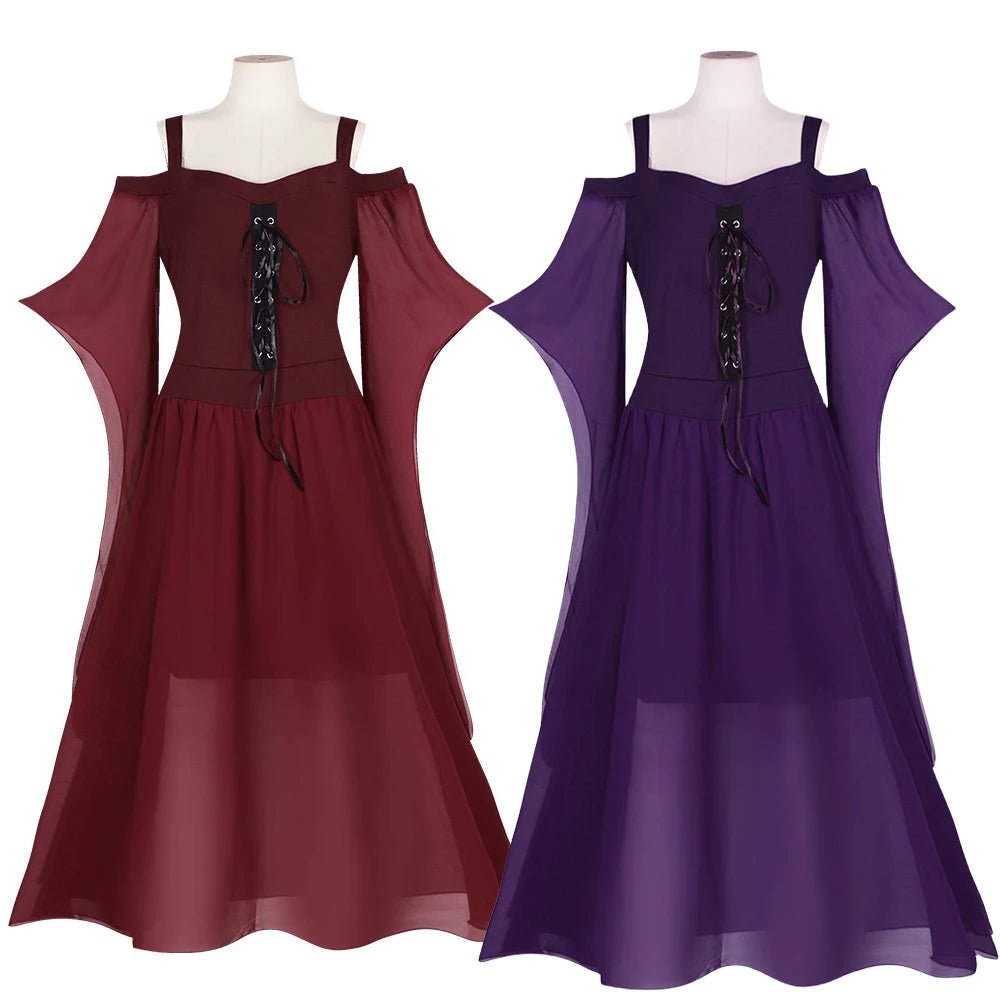 Halloween Witch Costume Women Gothic Steampunk Trumpet Sleeve Dress Medieval Renaissance Lace Up Wedding Feast Gown