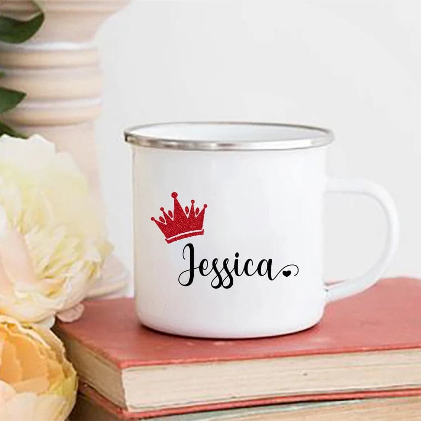 The Personalized Crown Coffee Mug, with its regal elegance and personalized charm, is the perfect blend. Crafted with care and designed for royalty, this custom enamel mug is the ideal gift for any occasion, be it an anniversary, birthday, or the romantic celebration of Valentine's Day. Adorned with a majestic crown design, this mug is more than just a vessel for your favorite brew, it's a statement piece fit for kings and queens alike. You can enjoy a soothing evening tea or sip your morning coffee. The Personalized Crown Coffee Mug is a reminder of love, admiration, and the joy of indulging in life's simple pleasures. Give the gift of royalty and warmth with this exquisite mug, and make every sip a majestic experience.