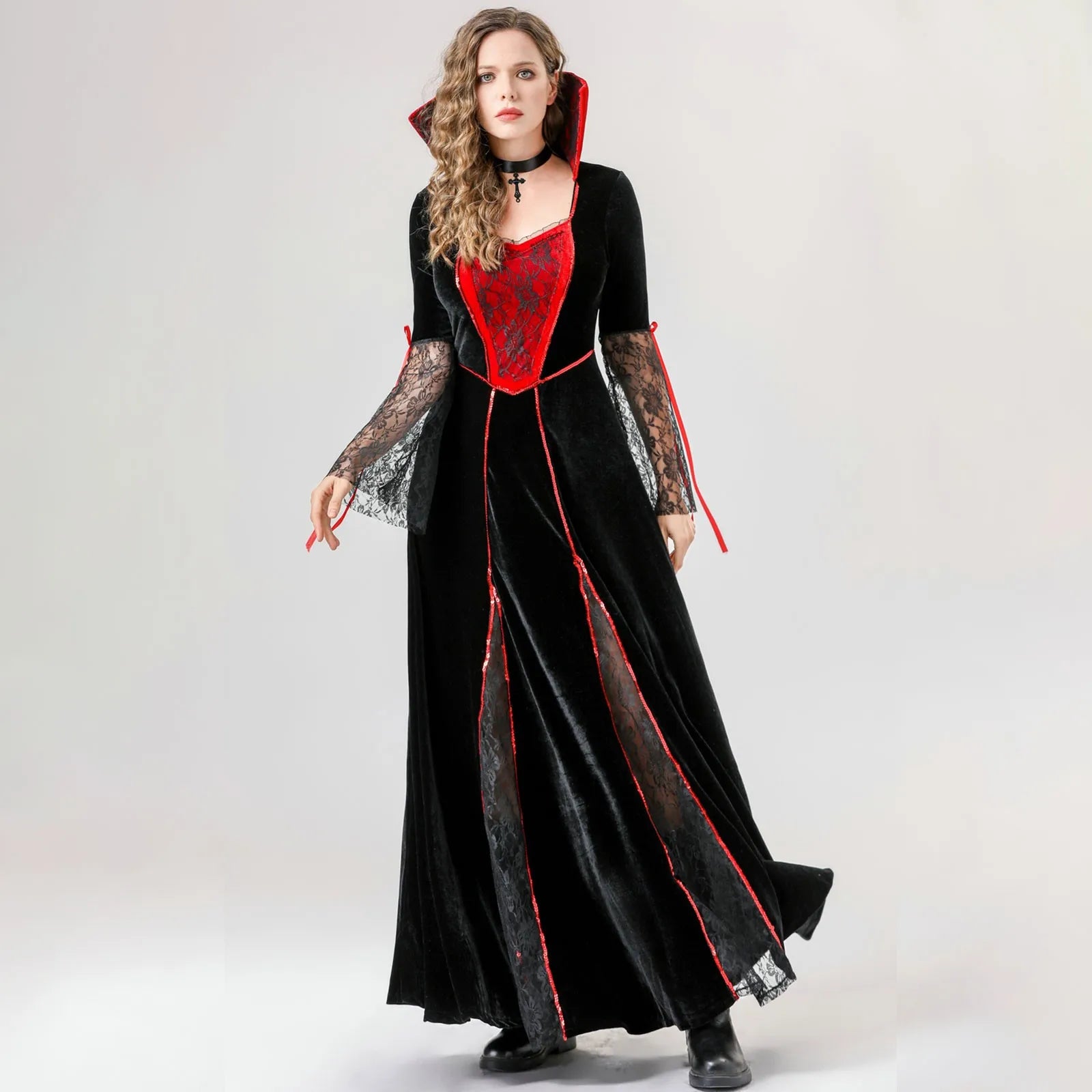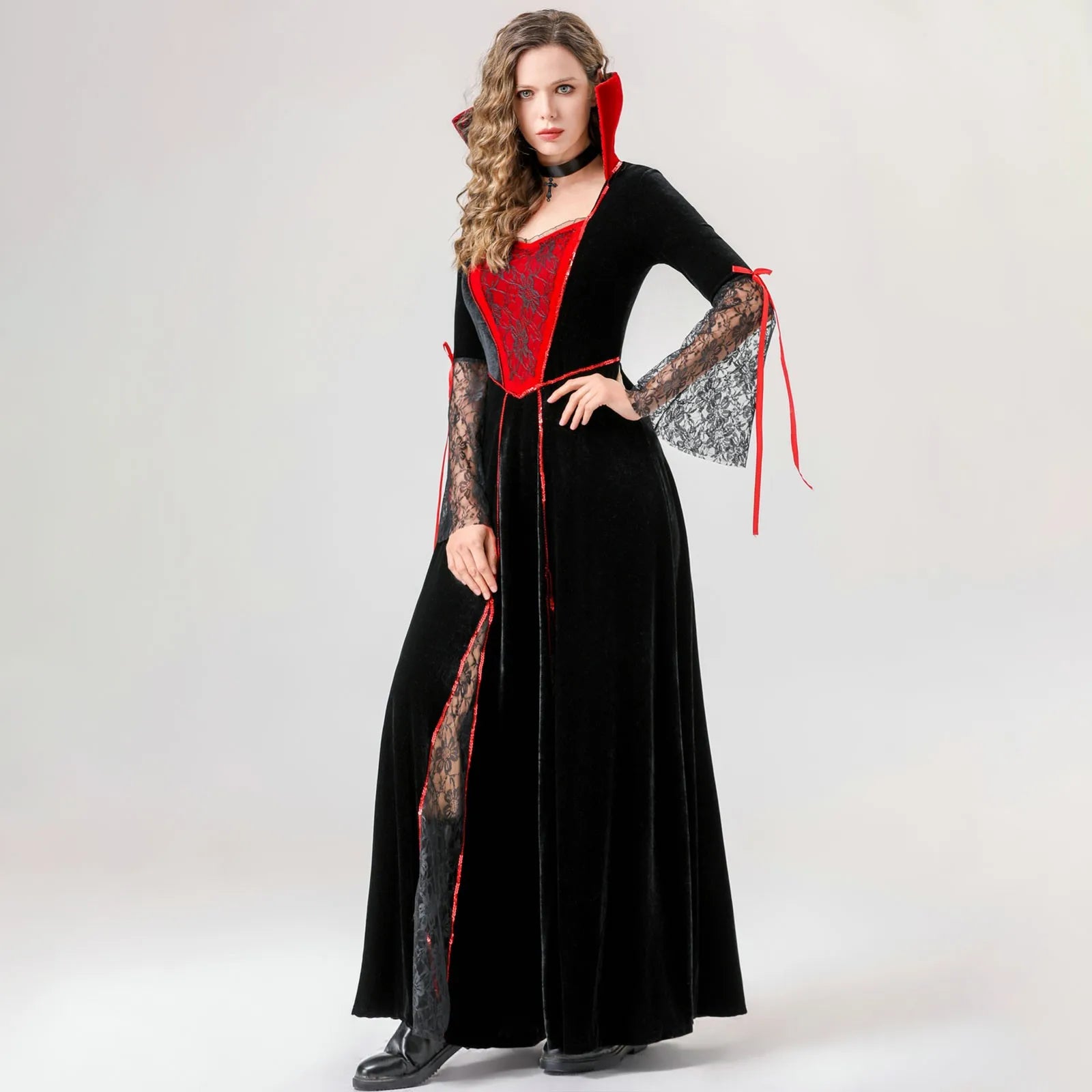 Women'S Halloween Costumes Red And Black Cos Vampire Long Dress Costume With Neck Ornaments Set Exquisite Mesh Patchwork Dresses